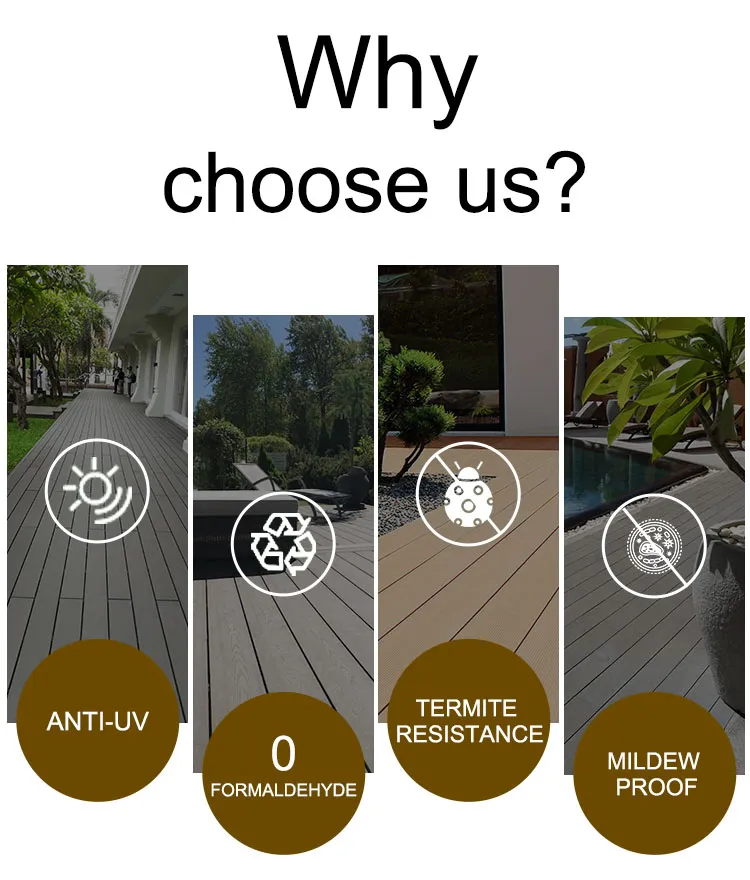 Composite outdoor decking is preferred for city construction and layout, such as parks, swimming pools, paths, marina docks and so on. We have improved some core performance for decking products, such as anti-slip, anti-oxidation, minimal moisture absorption, termite resistance, etc.